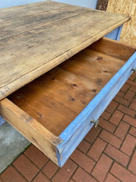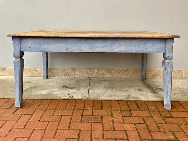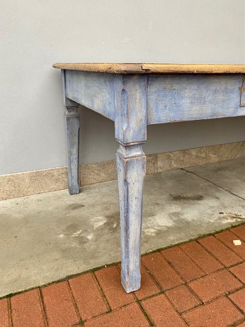 Tavolo Rettangolare in Castagno Laccato Azzurro Carta da Zucchero, piano in castagno naturale, presenta 2 cassetti.