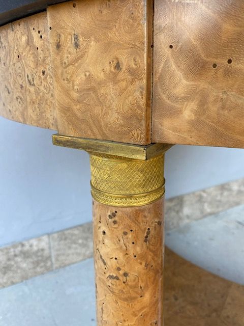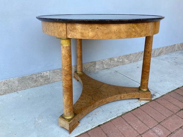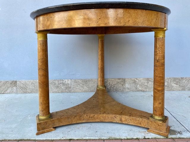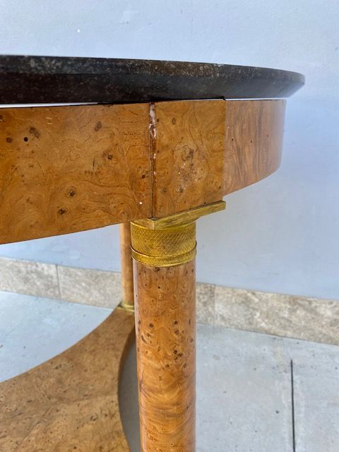 Important Round Empire Table in Tuia Burlwood features original gilded bronzes and a black marble top.