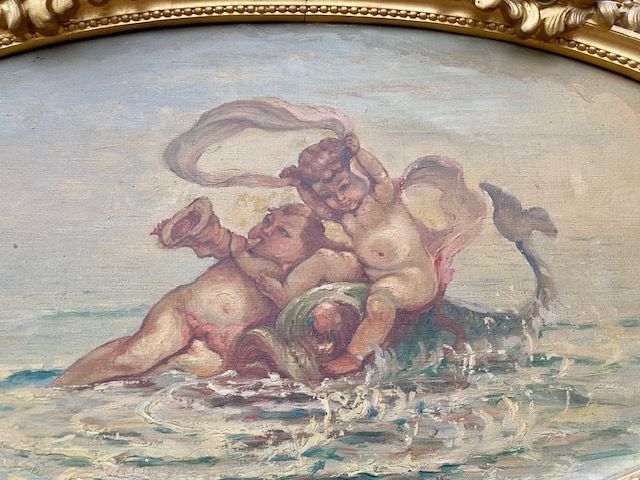 Lacquered and gilded Fondosala Mirror, surmounted by oil painting on canvas depicting putti in allegria.