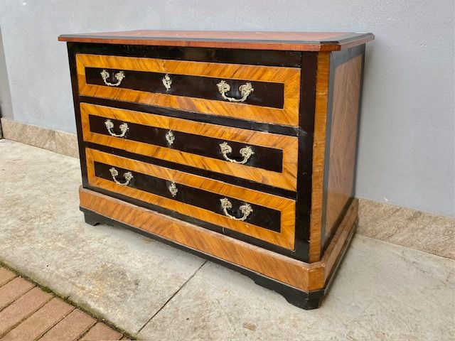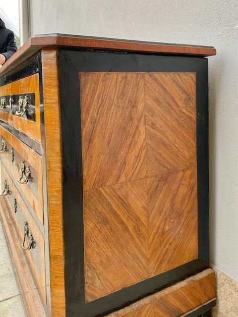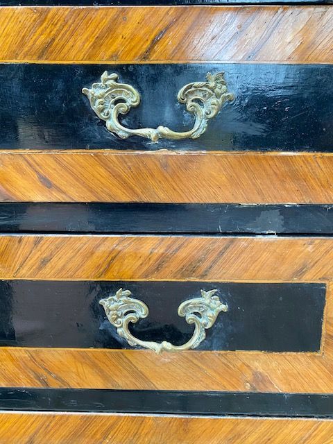 Ebonised chest of drawers with fish-bone moulding in Bois de Rose.