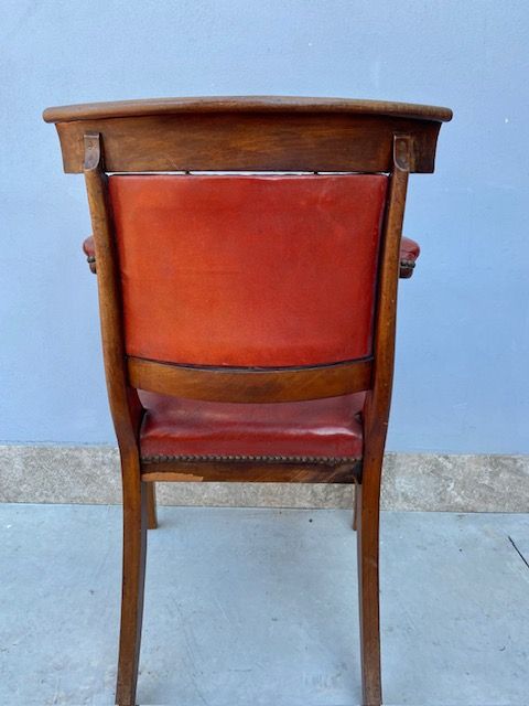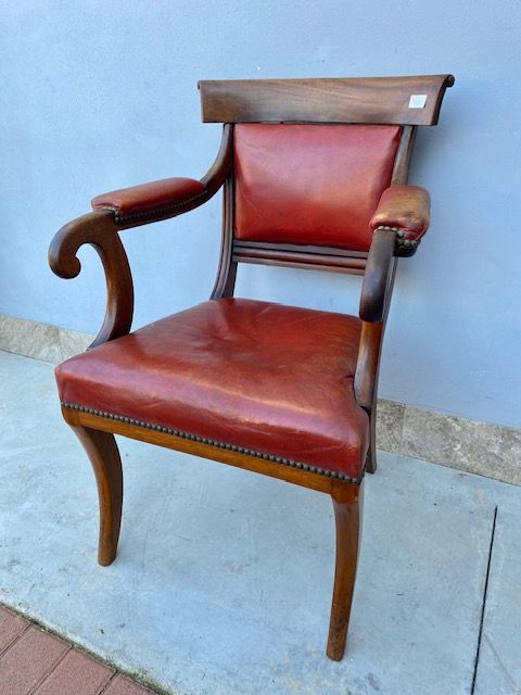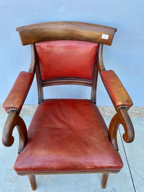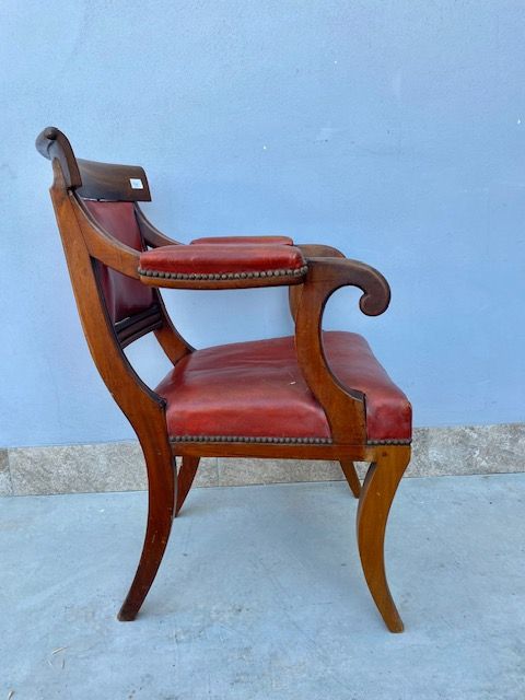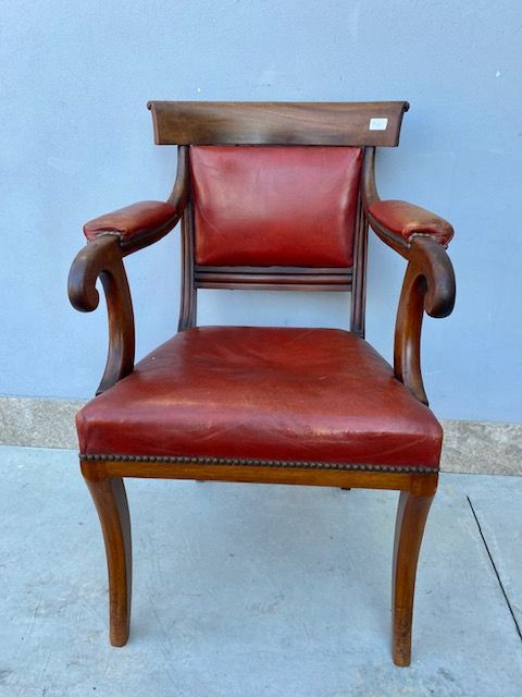 Poltrona da Scrittoio in Mogano, rivestita in cuoio rosso.