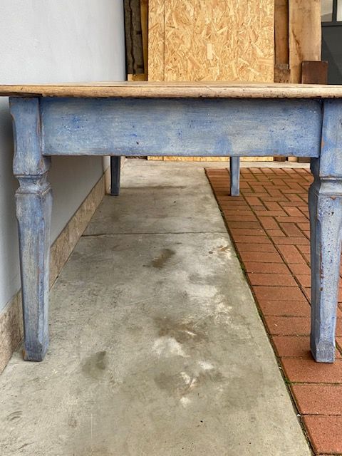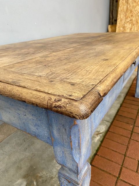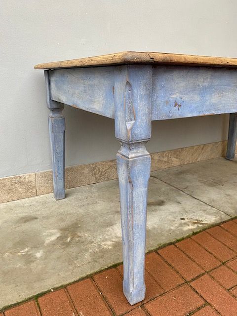 Tavolo Rettangolare in Castagno Laccato Azzurro Carta da Zucchero, piano in castagno naturale, presenta 2 cassetti.